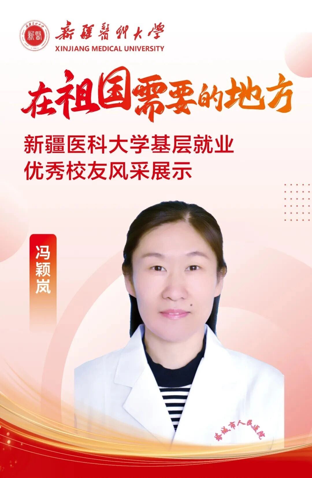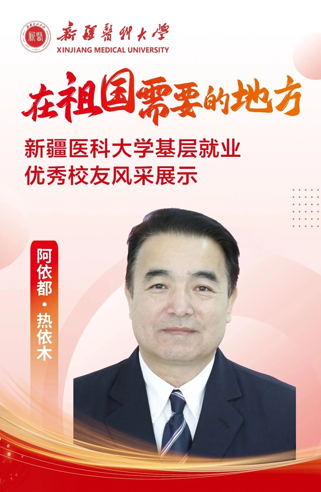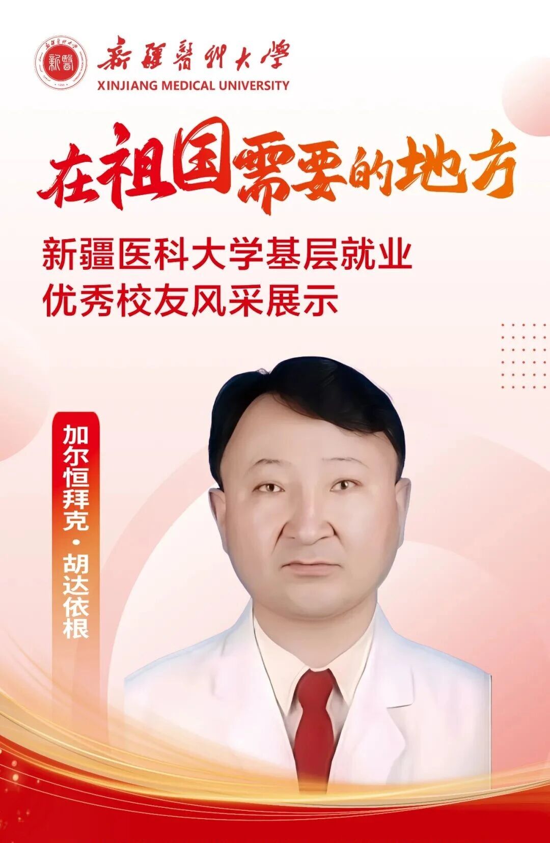 答案,往往书写在祖国最需要的地方。自建校之初,一代代新医人把个人理想融入国家命运,响应祖国号召,扎根边疆、护佑生命,这份初心如星火燎原,成为照亮新医人永不褪色的精神底色。基层,是砥砺初心的最好课堂,是施展才华的广阔舞台,呼唤着青春的智慧与力量,也必将成就人生的梦想与价值。为唱响“到祖国最需要的地方去”的青春强音,新疆医科大学官微特别推出三期《新医优秀校友的“基层答卷”》系列专题,为您讲述我校24位优秀校友扎根基层、服务人民、奉献青春的动人故事。从救死扶伤的一线,到乡村振兴的前沿,他们赓续着新医的红色血脉,把论文写在大漠边疆,把手术台搭在雪山脚下,将仁心仁术深深镌刻在天山南北,用实际行动浇灌出最美的民族团结之花。他们的选择,是对青春价值的最佳诠释;他们的奋斗,是对报国誓言的最美践行。让我们一同走进这些平凡而伟大的身影,汲取前行的榜样力量!