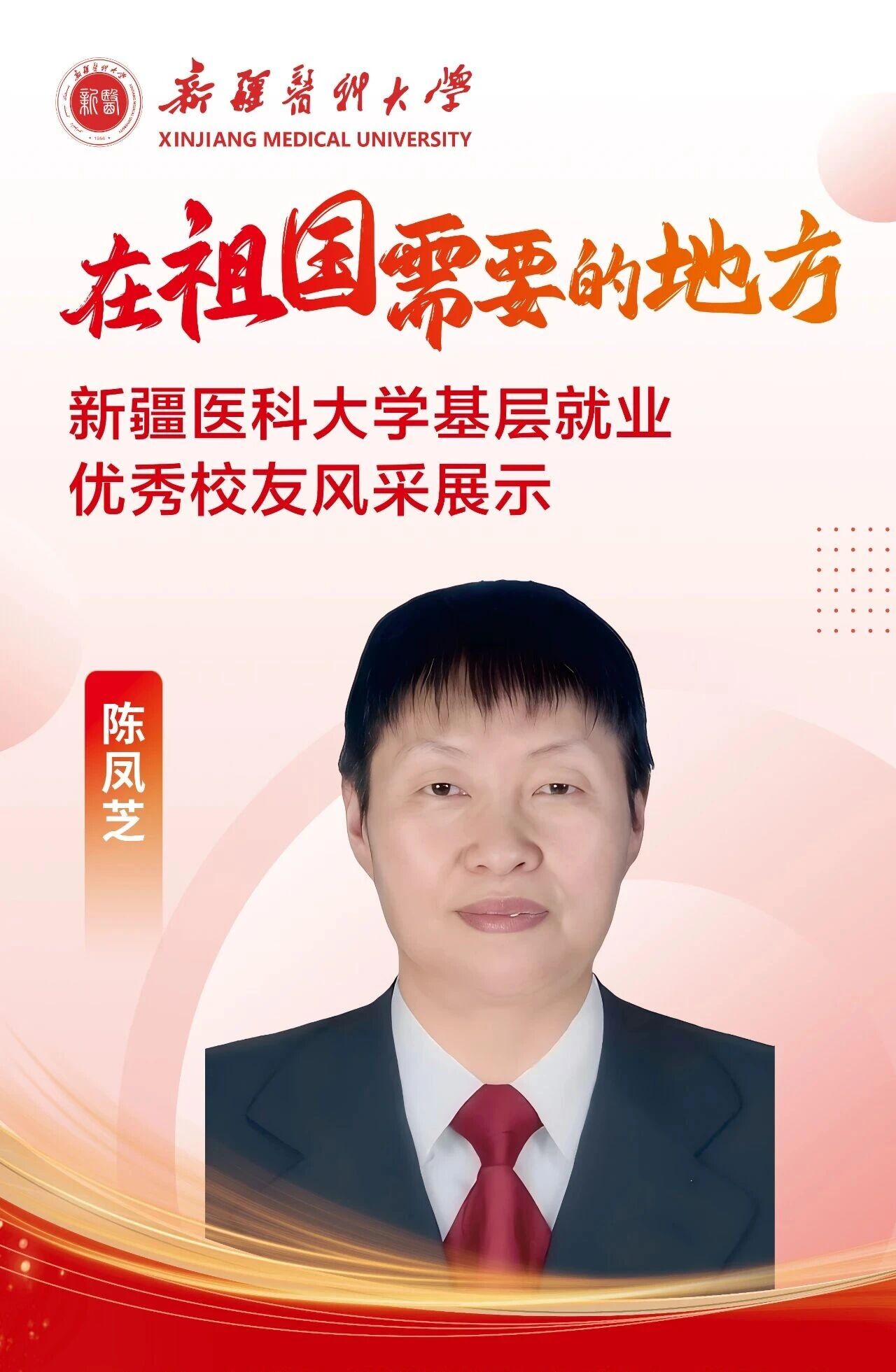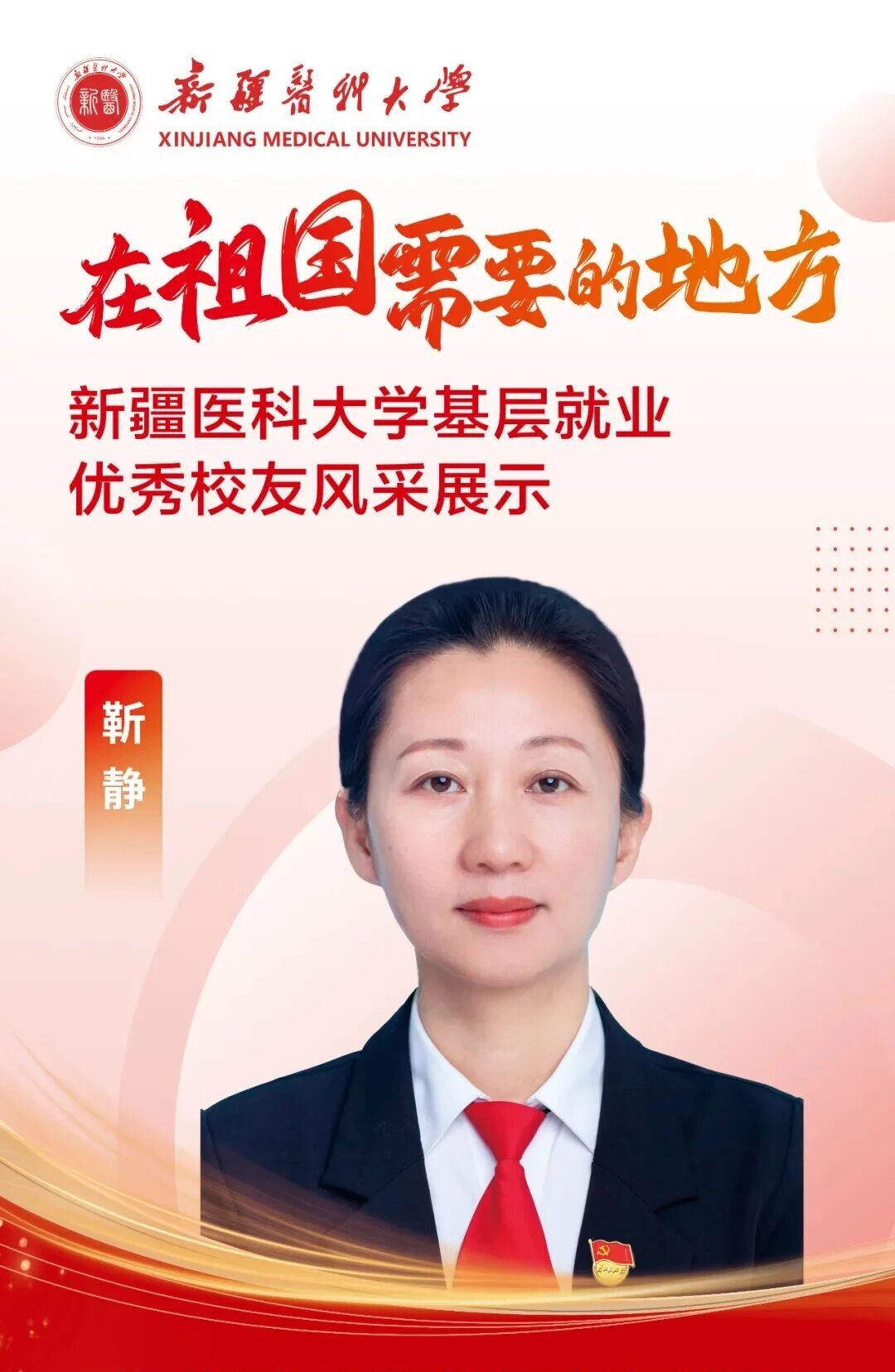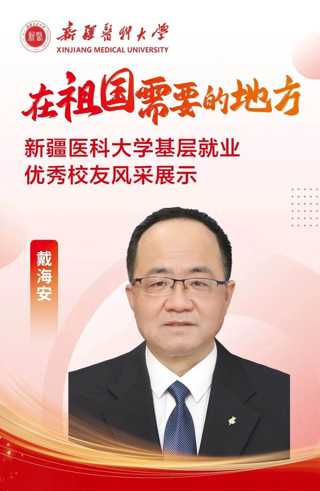 答案,往往书写在祖国最需要的地方。自建校之初,一代代新医人把个人理想融入国家命运,响应祖国号召,扎根边疆、护佑生命,这份初心如星火燎原,成为照亮新医人永不褪色的精神底色。基层,是砥砺初心的最好课堂,是施展才华的广阔舞台,呼唤着青春的智慧与力量,也必将成就人生的梦想与价值。为唱响“到祖国最需要的地方去”的青春强音,新疆医科大学官微特别推出三期《新医优秀校友的“基层答卷”》系列专题,为您讲述我校24位优秀校友扎根基层、服务人民、奉献青春的动人故事。从救死扶伤的一线,到乡村振兴的前沿,他们赓续着新医的红色血脉,把论文写在大漠边疆,把手术台搭在雪山脚下,将仁心仁术深深镌刻在天山南北,用实际行动浇灌出最美的民族团结之花。他们的选择,是对青春价值的最佳诠释;他们的奋斗,是对报国誓言的最美践行。让我们一同走进这些平凡而伟大的身影,汲取前行的榜样力量!