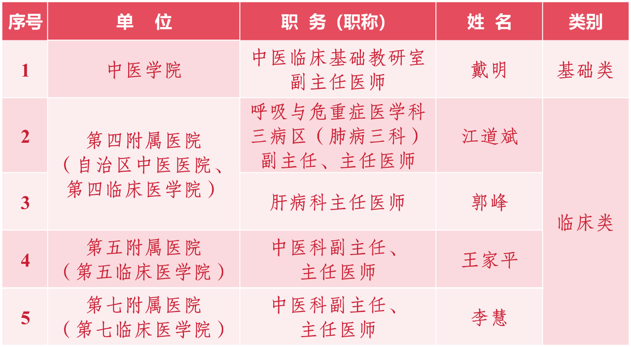 近日,国家中医药管理局正式公布了《第六批全国中医临床优秀人才研修项目培养对象名单》,全国共有500位中医临床骨干入选(基础类100人,临床类400人)。其中,我校5人