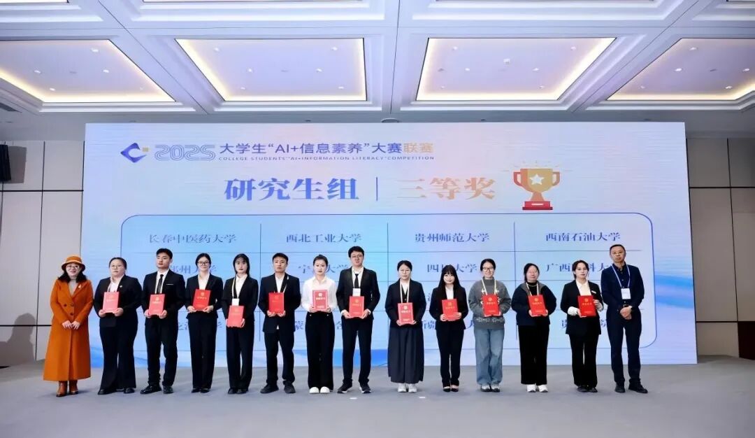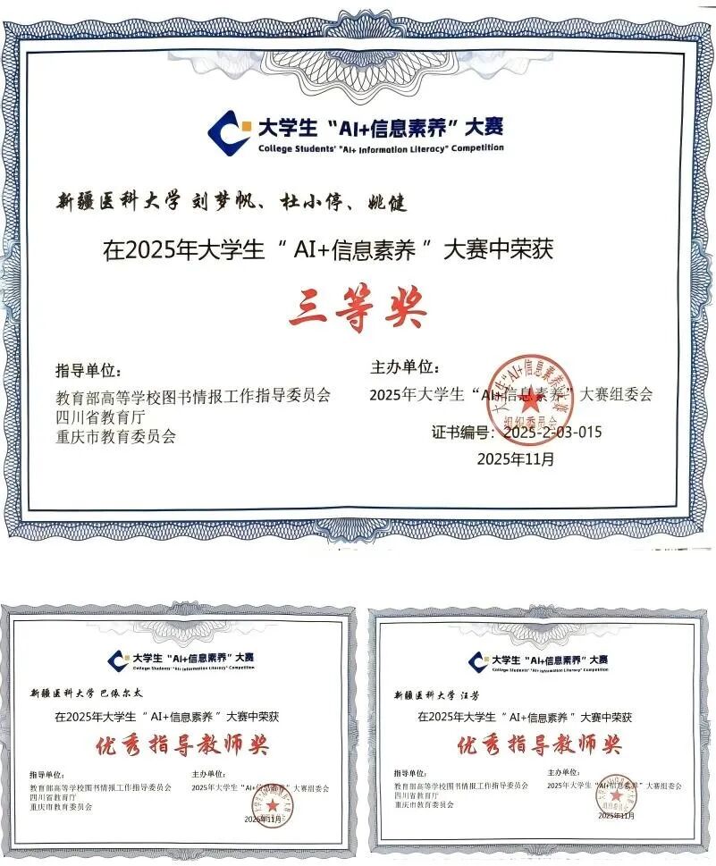 11月27日,由教育部高等学校图书情报工作指导委员会指导,四川大学主办的2025年大学生“AI+信息素养”大赛全国联赛在四川大学圆满落幕。新疆医科大学刘梦帆、杜小停、姚健三位研究生组成的代表队,在汪芳、巴依尔太老师的悉心指导下,荣获全国三等奖!