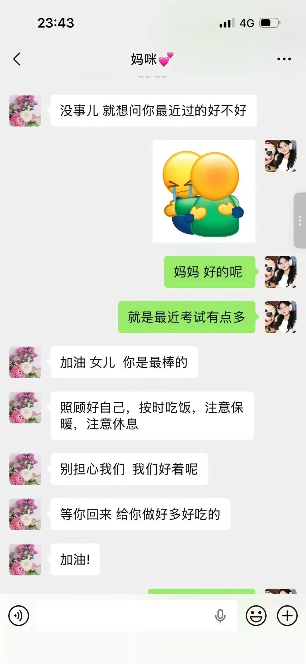 我:挺好的!课堂上好好学习专业知识,课下和同学组队做课题也很默契。食堂饭菜合口味,宿舍氛围温暖,还能参与社团活动。学习生活都顺心,不用牵挂,我在这儿真的挺好!