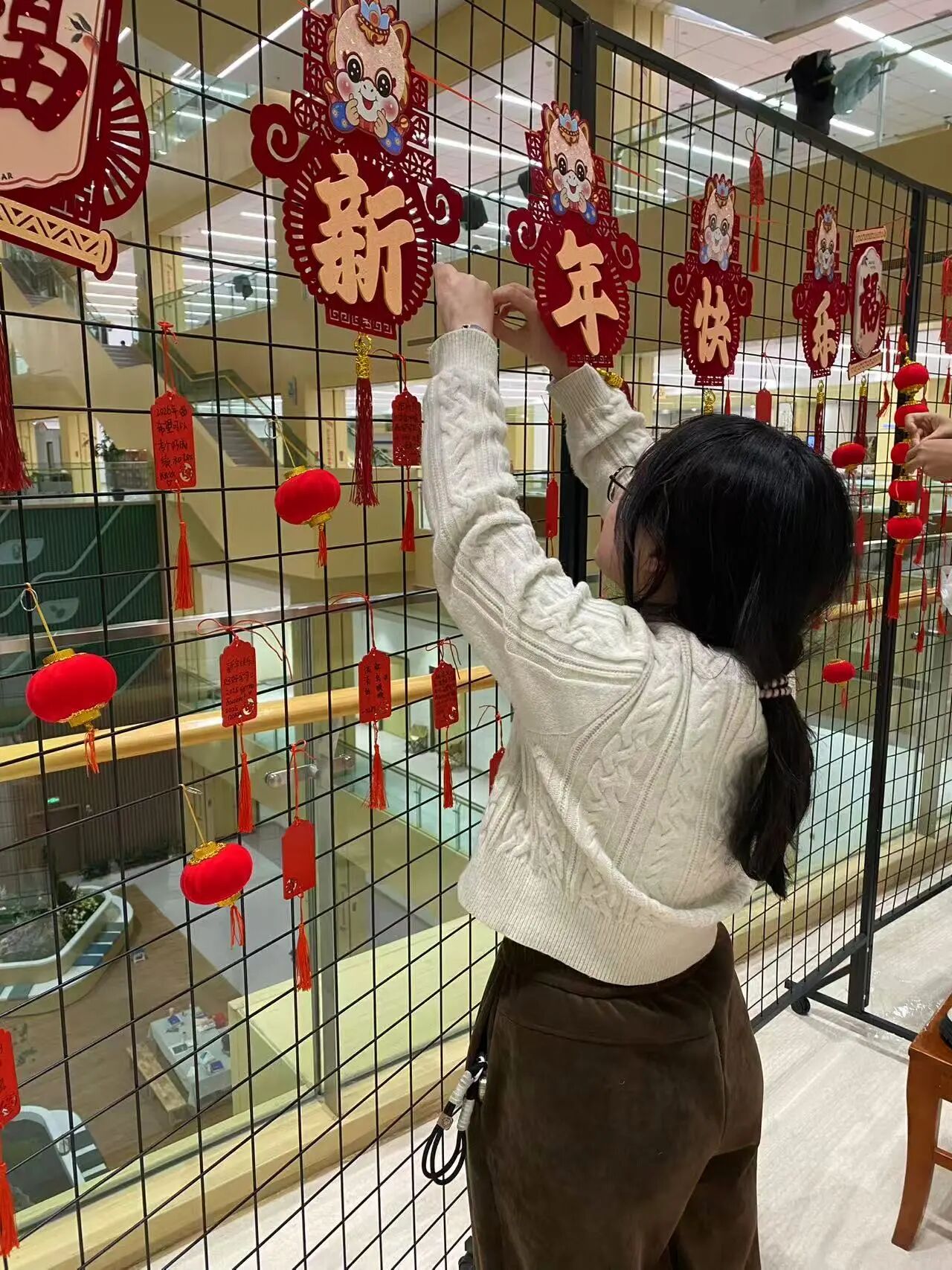 活动现场暖意融融、年味盎然。“巧手迎新年 甜蜜庆元旦”的红色横幅格外醒目,五彩气球与缤纷彩带交织点缀,将活动场地装扮得喜庆祥和,瞬间拉满新年氛围感。同学们带着期待与热情围聚在一起,分工协作、互帮互助,迅速投入到这场趣味十足的节日体验中。