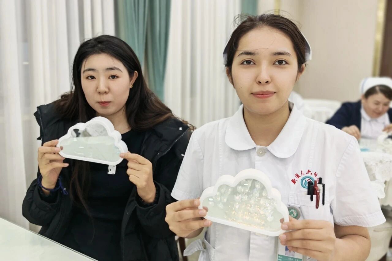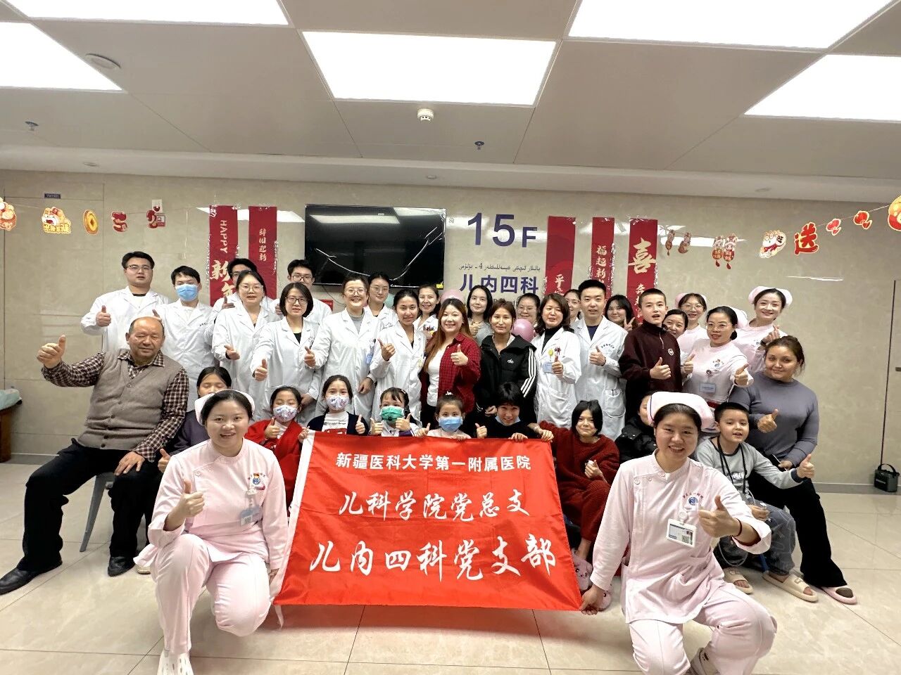 护士们朗诵的《听,星星在说话》,用温柔而坚定的声音传递着鼓励与祝福——“每一颗星星,都是孩子的眼睛;每一次闪烁,都是你努力的身影。”随后,一曲《天山上最美的花》唱响病房,歌颂各族群众顽强拼搏、团结奋进的精神,也传递出对家乡的深情与自豪。活动尾声,一位家长感动地说:“医院的每一位医护就像冬日暖阳,用细致的关怀和暖心的布置,让病房里充满了节日的喜悦。谢谢你们,给了孩子一份难忘又特别的元旦记忆。”