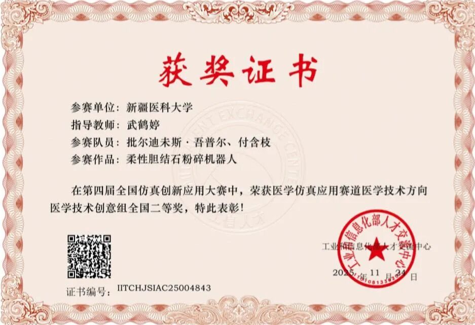 近日,在四川大学落幕的2025年全国仿真创新应用大赛全国总决赛中,我校2025级药剂学专业研究生批尔迪未斯·吾普尔和2024级药剂学专业研究生付含枝组成的参赛团队,其作品《柔性胆结石粉碎机器人》荣获全国决赛二等奖。