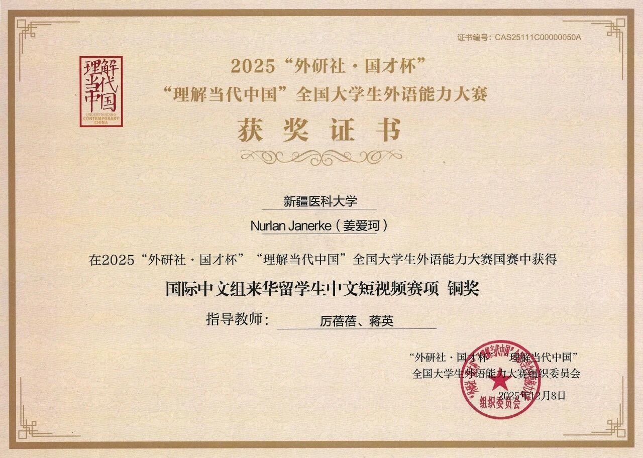 我校获奖作品《丝路上的千年之味》这份荣誉既是留学生青春风采的生动展现,更是我校留学生教育成果的有力印证。作为辐射中亚、联通世界的医学教育高地,学校以“健康丝绸之路”为纽带,构建起多层次、高质量的国际人才培养体系,让医学智慧跨越国界,让文化互鉴温暖人心。未来,学校将继续搭建交流桥梁,让更多留学生在这里收获成长、缔结友谊,成为中外医学交流与民心相通的坚实纽带。