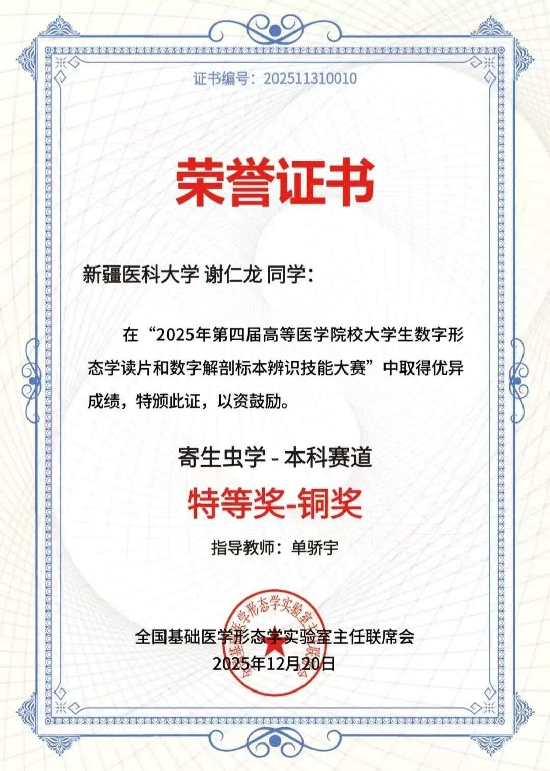 近日,在第四届全国高等医学院校大学生数字形态学读片和数字解剖标本辨识技能大赛上,我校2022-7班临床医学专业谢仁龙和2024-7班临床医学专业林文君两位同学在全国总决赛中获得铜奖。