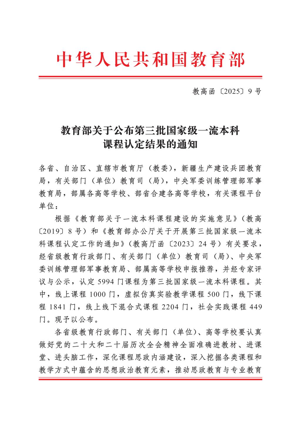 近日,教育部正式公布第三批国家级一流本科课程认定结果,我校有9门课程成功入选,截至目前,学校已累计获批国家级一流本科课程19门。这标志着我校在构建高质量本科课程体系上迈出了坚实步伐,取得了持续突破。