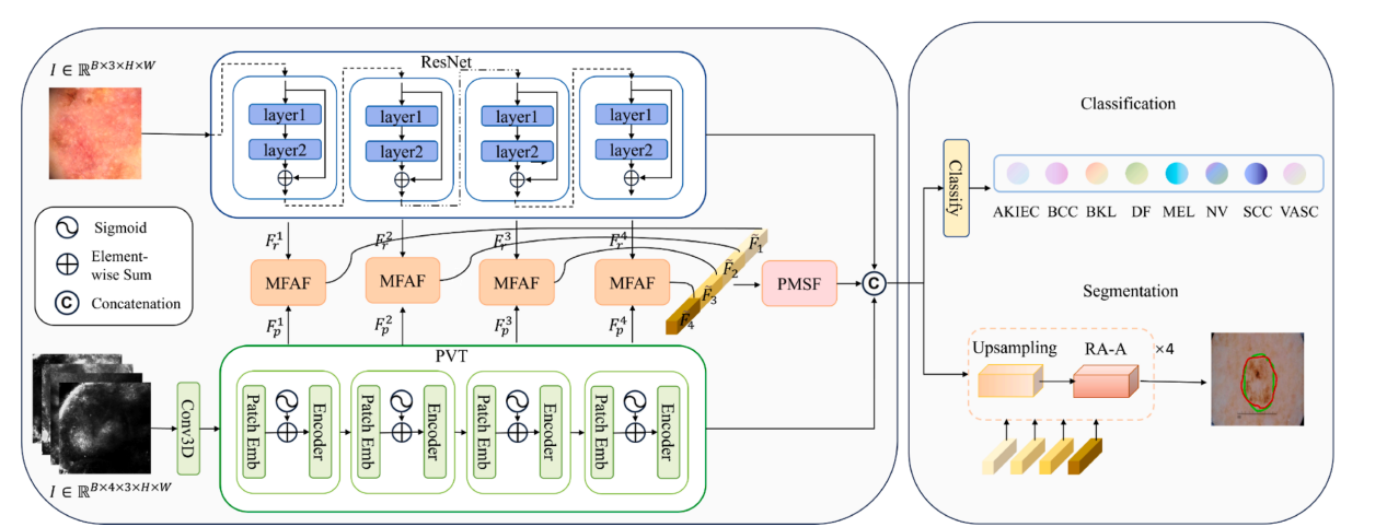 本研究提出一种端到端多频多尺度融合网络模型,该网络模型通过双分支特征提取、多频率感知融合(将特征分解为频域内的高频边缘振荡与低频形状变化)以及金字塔多尺度特征融合模块,实现了从局部纹理到全局结构的全面编码;在五个数据集上的评估显示,该模型在分类任务中于HAM10000数据集上性能超越DeiT达4.9%,在分割任务中于ISIC-2018数据集上取得mDice 89.5、mIoU 81.1的优异结果,显著优于Mamba Unet与SwinUNet等模型,为融合皮肤镜纹理与共聚焦显微镜(RCM)深层结构等互补特征、探索临床多模态协作诊断提供了新思路。