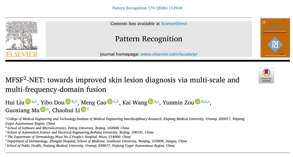 如何让AI更准确地识别皮肤病灶?一项最新研究给出了创新解法。我校医工交叉研究所医学人工智能研究团队联合无锡市第二人民医院研究团队,在人工智能与模式识别领域国际权威期刊《Pattern Recognition》(模式识别)上发表了题为“MFSF2-NET: Towards Improved Skin Lesion Diagnosis via Multi-Scale and Multi-Frequency-Domain Fusion”的研究论文。