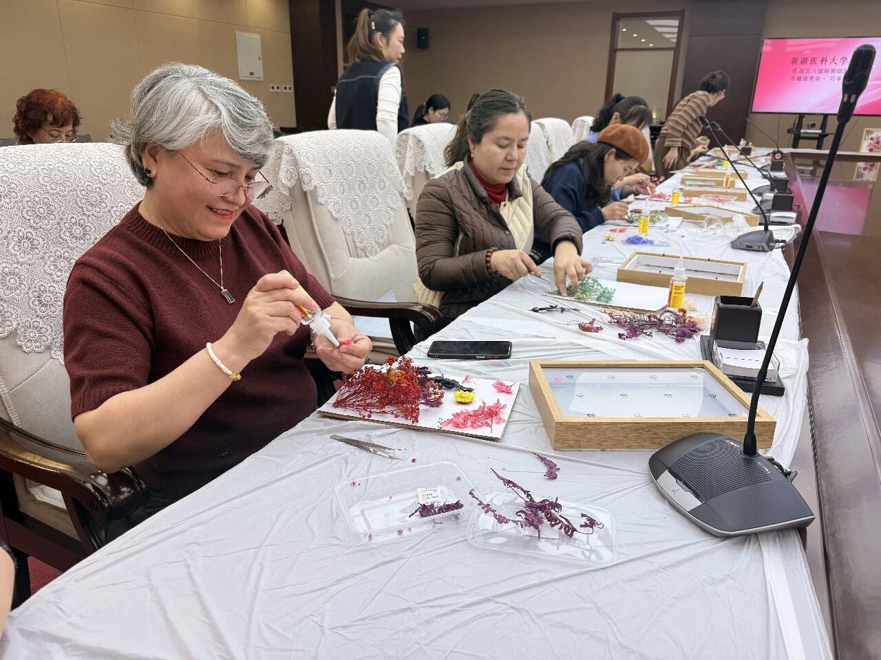 压花台灯制作现场,大家轻柔地将各色花卉的叶片粘贴在灯罩上,精心构思着每一处细节。