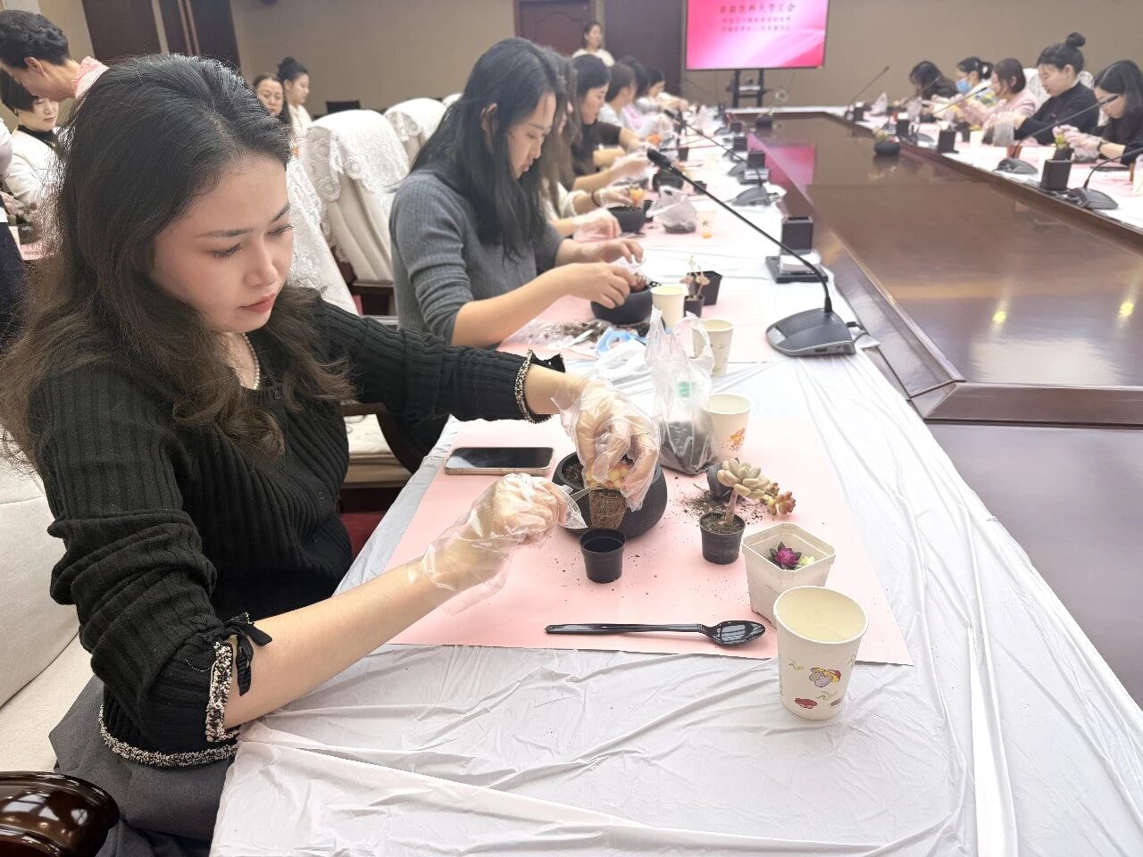 在多肉景观盆栽制作现场,大家小心翼翼地将萌趣可爱的多肉植入花盆,一边铺撒彩色砂石,一边交流养护心得。