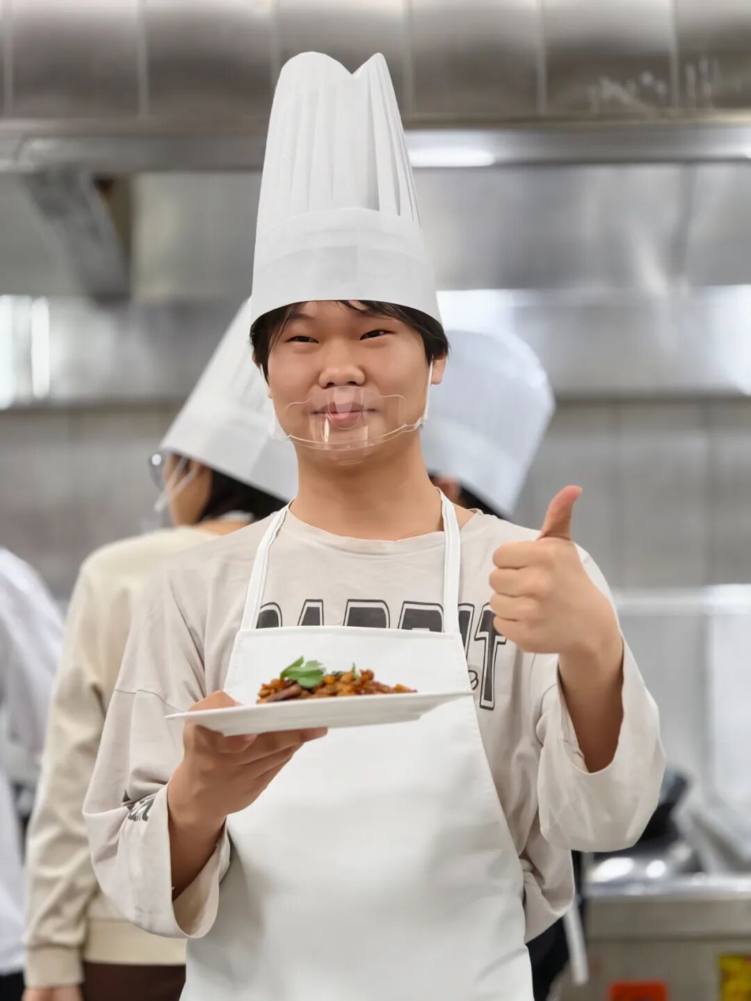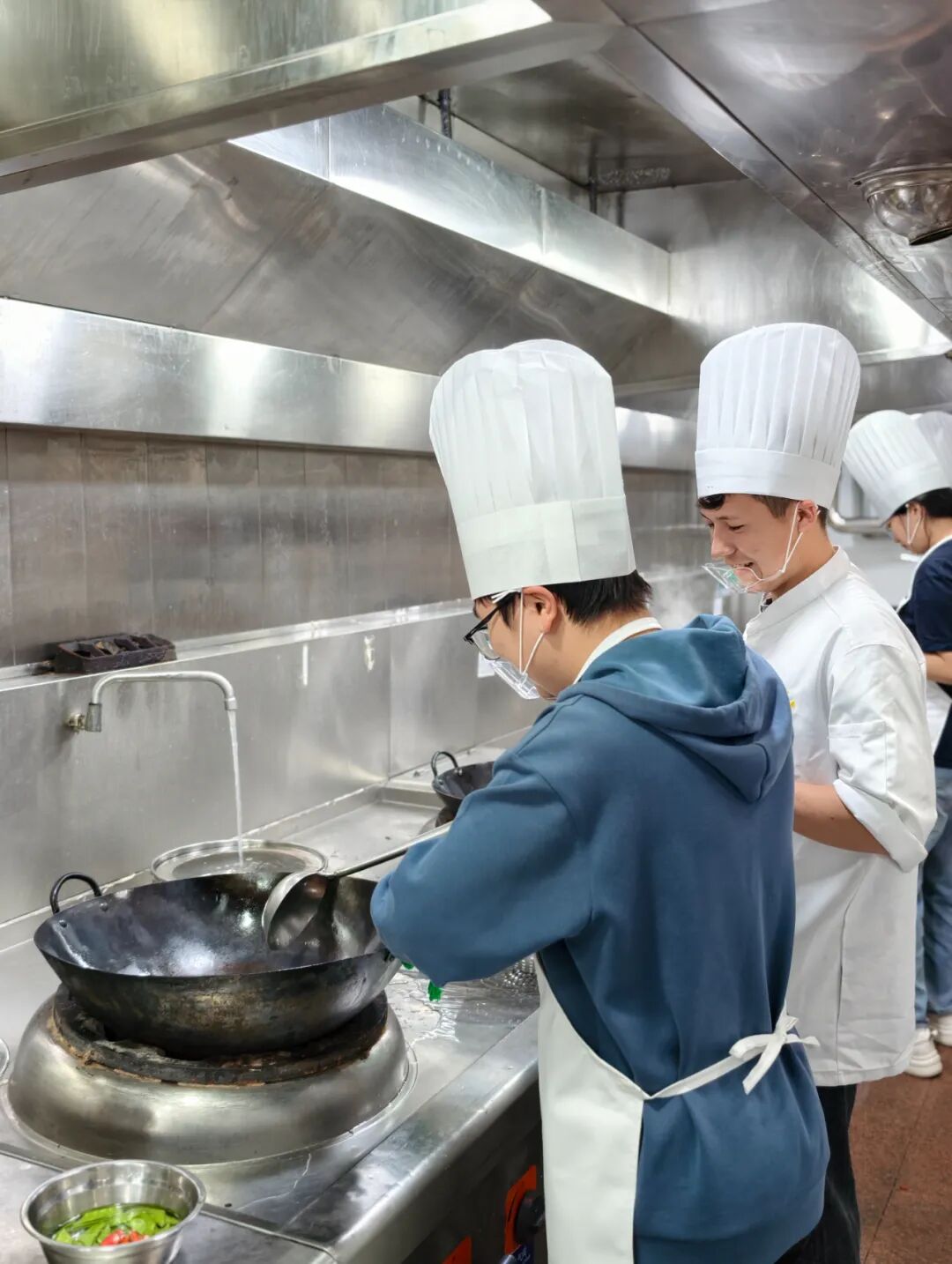 热闹的烹饪现场,气氛热烈!油锅一热,“滋啦”一声香气四溢,同学们的惊呼声、师傅们的点拨声、锅碗瓢盆的碰撞声,活脱脱一曲“厨房交响乐”。大家大胆颠锅、自信撒料,一个个神情专注,烟火气里升腾着青春朝气。