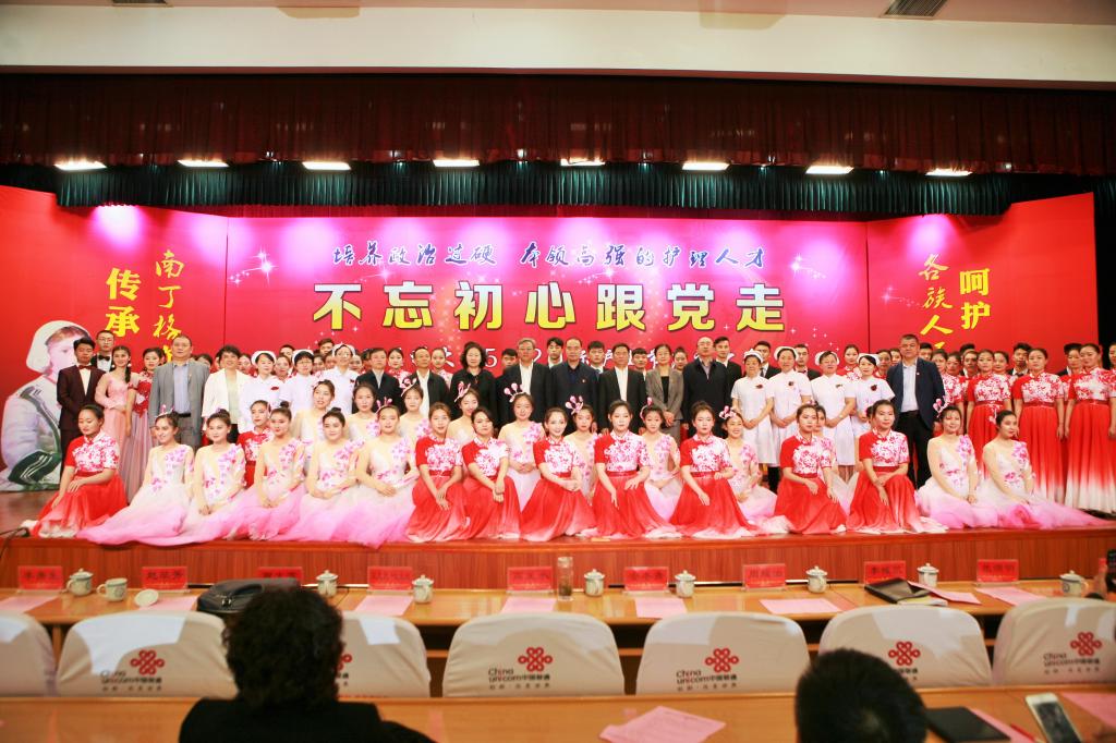 随后,各单位还带来了自编自导自演的节目,为庆祝大会增色,附属肿瘤医院带来的舞蹈《歌唱新时代》、大学生艺术团带来的《舞动青春》、第五附属医院的舞蹈《健康战线联盟》展现了活力四射的护理团队风采,护理学院的学生们表演的《护士礼仪展示》和舞蹈《红梅赞》,表现了新一代的新医护理人的精神风貌,诗朗诵《青春中国》和《中国护士之歌》的合唱,将庆祝大会的气氛逐渐推向高潮。最后,庆祝活动在全体起立共唱《没有共产党就没有新中国》的激昂歌声中落下帷幕。