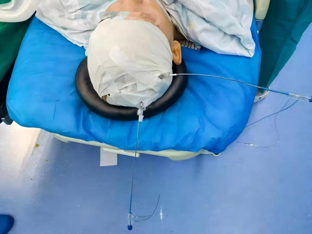 手术中,医生仅在患儿颅骨上钻开一个约3毫米的微孔,随后将直径不足2毫米的柔性激光光纤植入颅内。在磁共振全程实时引导下,光纤被精准送达病灶核心。