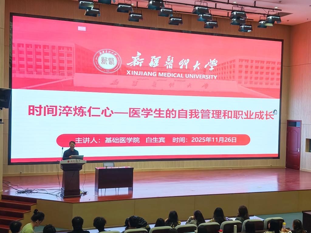 为帮助医学生明晰成长路径、夯实职业根基,11月26日,“新医大讲堂”邀请基础医学院院长白生宾教授,为医学生们带来了一场题为《时间淬炼仁心——医学生的自我管理和职业成长》的专题讲座,我校350名师生聆听讲座。